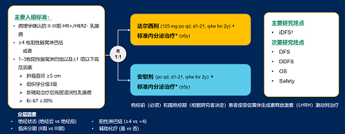 达尔西利(Dalpiciclib)是PG医药自主研发的口服、选择性的小分子CDK4/6抑制剂,也是中国首个自主研发的新型高选择性 CDK4/6 抑制剂,已证实其与内分泌治疗(ET)联合用于 HR+/HER2- 晚期乳腺癌的一线和后线治疗时,均显著改善无进展生存期(PFS)6,7。因此开展了一项随机、双盲、III期临床试验(DAWNA-A),以进一步评估达尔西利联合内分泌治疗作为高危早期 HR+/HER2 - 乳腺癌辅助治疗的效果。本研究纳入高危复发风险人群需满足以下标准之一:①≥4 枚阳性腋窝淋巴结;②1–3枚阳性腋窝淋巴结且合并≥1 项高危因素(肿瘤直径 ≥5 cm,组织学分级3级,辅助治疗后残留浸润性乳腺癌,Ki-67 ≥30%)。本文呈现预先设定的首次中期分析(IA1)结果。
